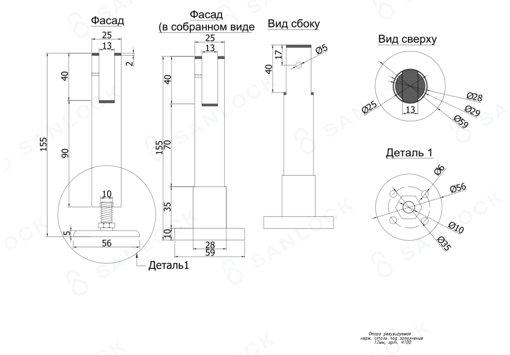 Опора регулируемая H=100мм., нерж., с ПВХ вкладышем под заполнение 12мм.